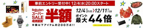 楽天市場では、2019年12月4日(水)PM8:00~12月11日(水)AM1:59までの期間限定で、令和最後の楽天スーパーSALEを開催します! 楽天スーパーセールとは、楽天市場最大級のイベントで時間限定のタイムSALEや割引クーポンのプレゼントなど、お得なキャンペ…