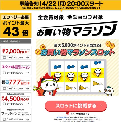 楽天お買い物マラソンスロット(事前告知)が開催されます! 開催期間:2019年4月22日(月)20:00~4月26日(金)01:59まで! 最大で5,000ポイントが当たります。 スマホとパソコンで1回ずつチャレンジ可能です。 当選内容・本数 …