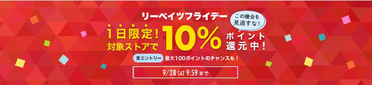 楽天リーベイツ(Rebates)では、2019年9月27日(金)10:00~30日(月)9:59迄の3日間限定で、1日限定10%還元ストア出現のリーベイツフライデー開催中です!