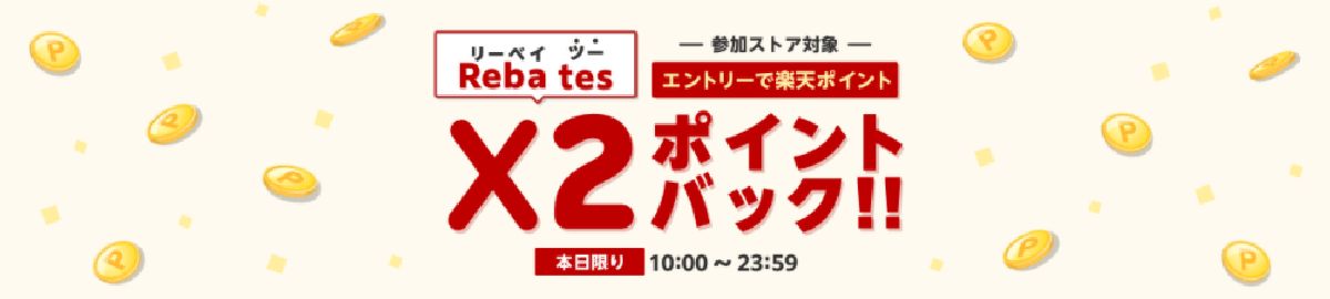 - 楽天リーベイツ(Rebates)で、1日限定!対象ストアのポイント還元率が2倍になるダブルポイントバックキャンペーン実施!